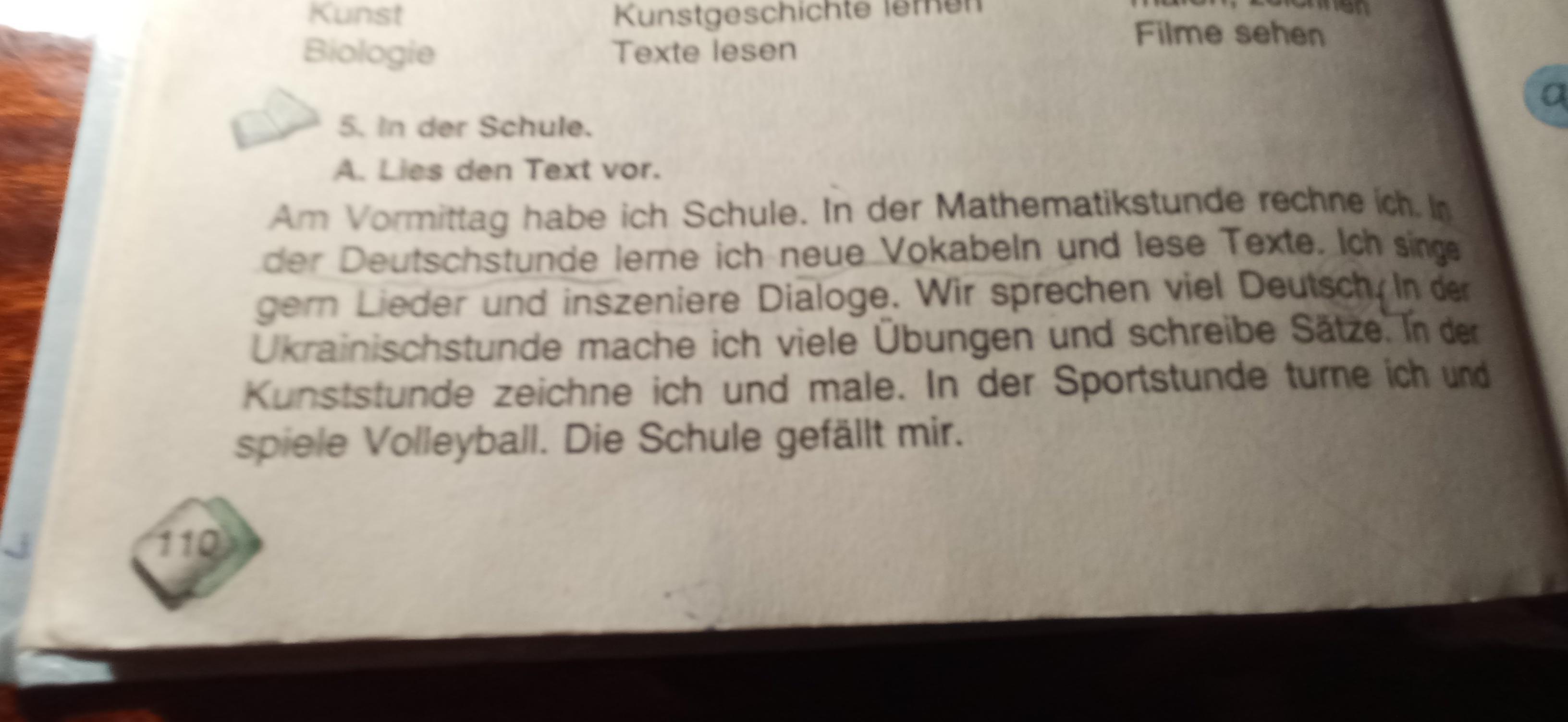 Am Vormittag hatte ich schuhle. In der Matematikstunde habe ich gerechnet. In der Deutschstunde lernte ich neue Vokabeln und habe Texte gelesen. Ich singte gern Lieder und inszenierte Dialoge. Wir haben viel Deutsch gesprochen. In der Ukrainischstunde machte ich viele übungen und schreibte Sätze. In der Kunststunde habe ich gemahlt und gezeichnet. In der Sportstunde turnte ich und spielte Volleyball. Die Schuhle hat mir gefallen.