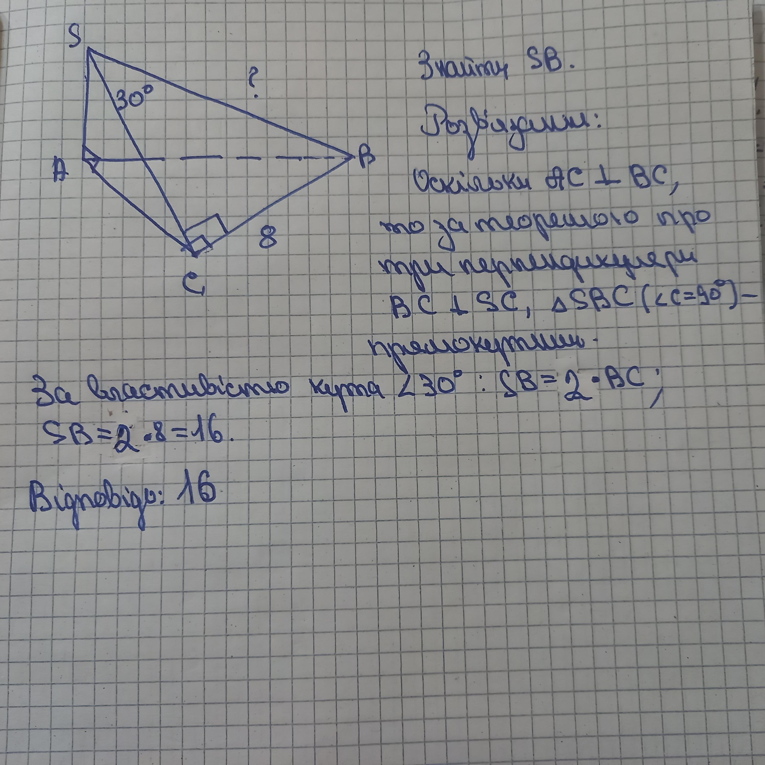 Основа трикутної піраміди - прямокутний трикутник АВС з прямим кутом С. Ребро SA перпендикулярне до основи піраміди, ребра SC і SB утворюють кут 30º. СB = 8.Знайти SВ.