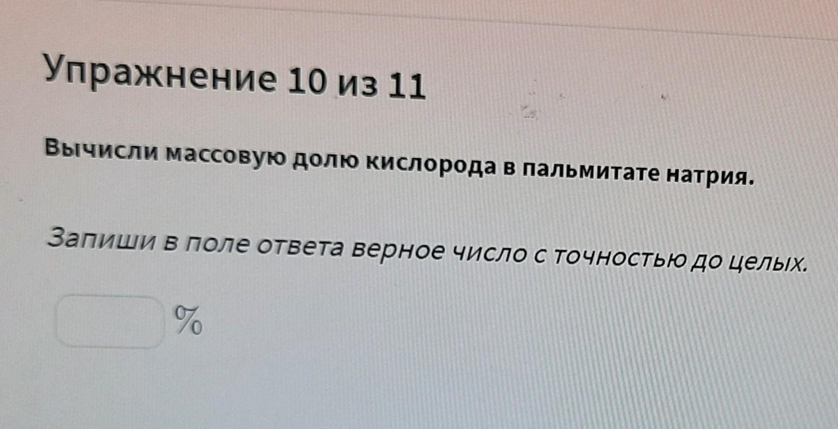 массовая доля кислорода = (масса кислорода в молекуле/молекулярная масса пальмитата натрия) x 100%