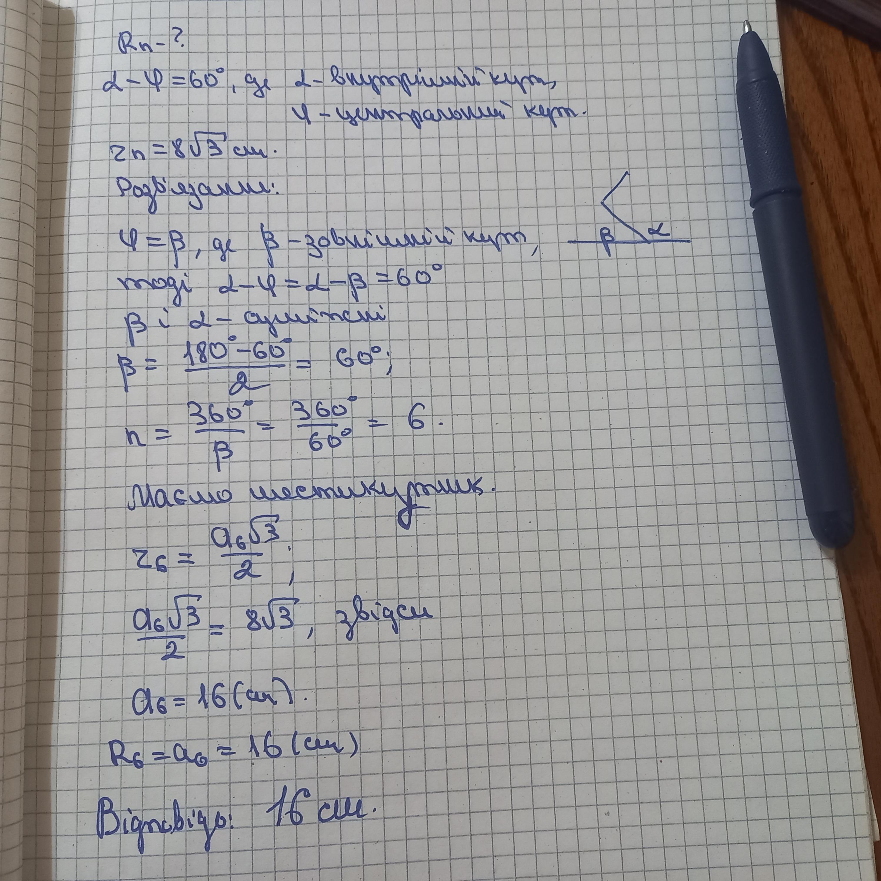 Знайди радіус описаного навколо правильного многокутника кола, якщо його внутрішній кут більше за центральний на 60°, а радіус вписаного кола дорівнює 8 кореня з 3см?