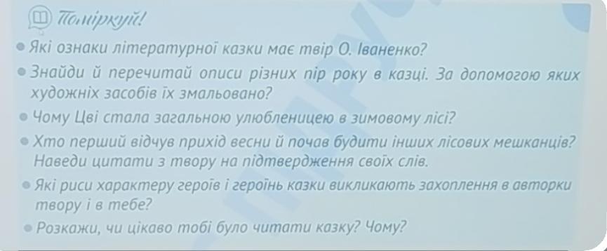 3) чому цві стала загально улюбленицею в зимовому лісі? 4) хто перший відчув прихід весни й почав будити інших лісових мешканців? Наведи цитати з твору на підтвердження своїх слів. 5) які риси характеру героїв і героїнь казки викликають захоплення в авторки твору і в тебе ? 6) розкажи, чи цікаво тобі було читати казку? Чому ?