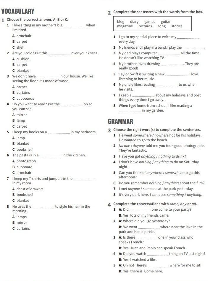 Відповідь:1.A,C,A,B,C,B,A,B 2.diary,guitar,games,pictures,song,stories,blog,magazine 3.somewhere,no one,anything,anything,somewhere,anything,someone,anything 4.anyone,somewhere,anyone,something,nowhere