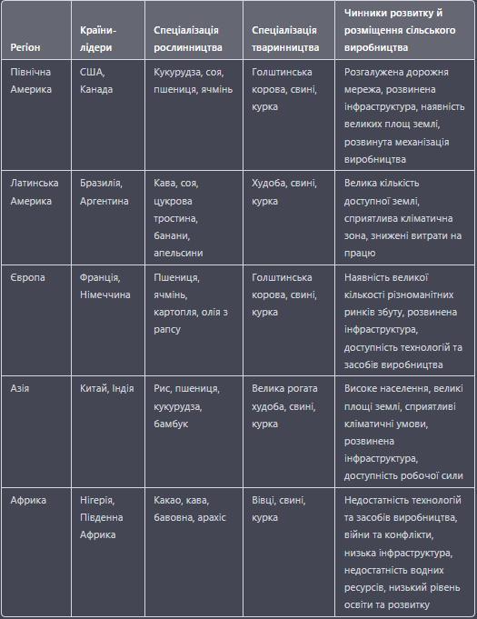 Спираючись на наявні у шкільному атласі географічні карти, порівняйте просторову організацію виробництва сільськогосподарської продукції у країнах і регіонах світу. Результати порівняння занотуйте в таблицю: