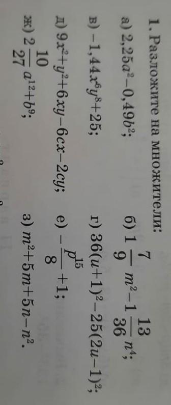 1. Разложите на множители: а) 2,25a²-0,4962; в) -1,44x y8+25; д) 9х2+у2+6ху-6cx-2cy; ж) 2 ; a12+b9; 10 27 7 6) 1 m2-1 9 г) е) - 3) 13 36 36(u+1)2-25(2u-1)2; 15 nt; +1; m2+5m+5n-n². 8 ПОМОГИТЕ ПЖ СРОЧНО НАДО