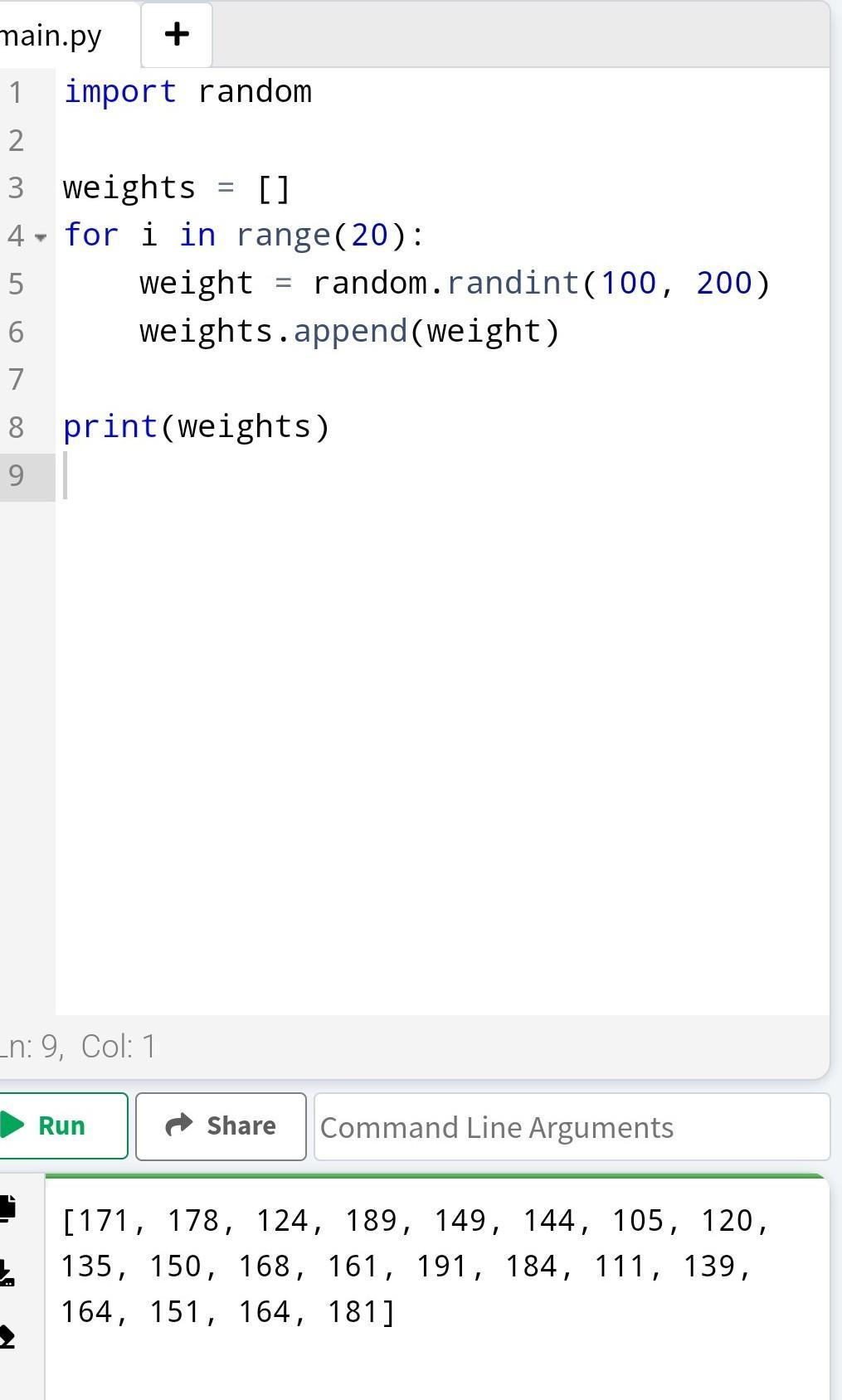 Здесь мы используем цикл forдля заполнения массива weights20 случайными весами. Каждый раз внутри цикла мы вызываем функцию randint()из модуля randomи сохраняем сгенерированное случайное число в переменную weight. Затем мы используем этот массив weightsс помощью метода append(). В конце мы выводим weightsна экран, используя функцию print().