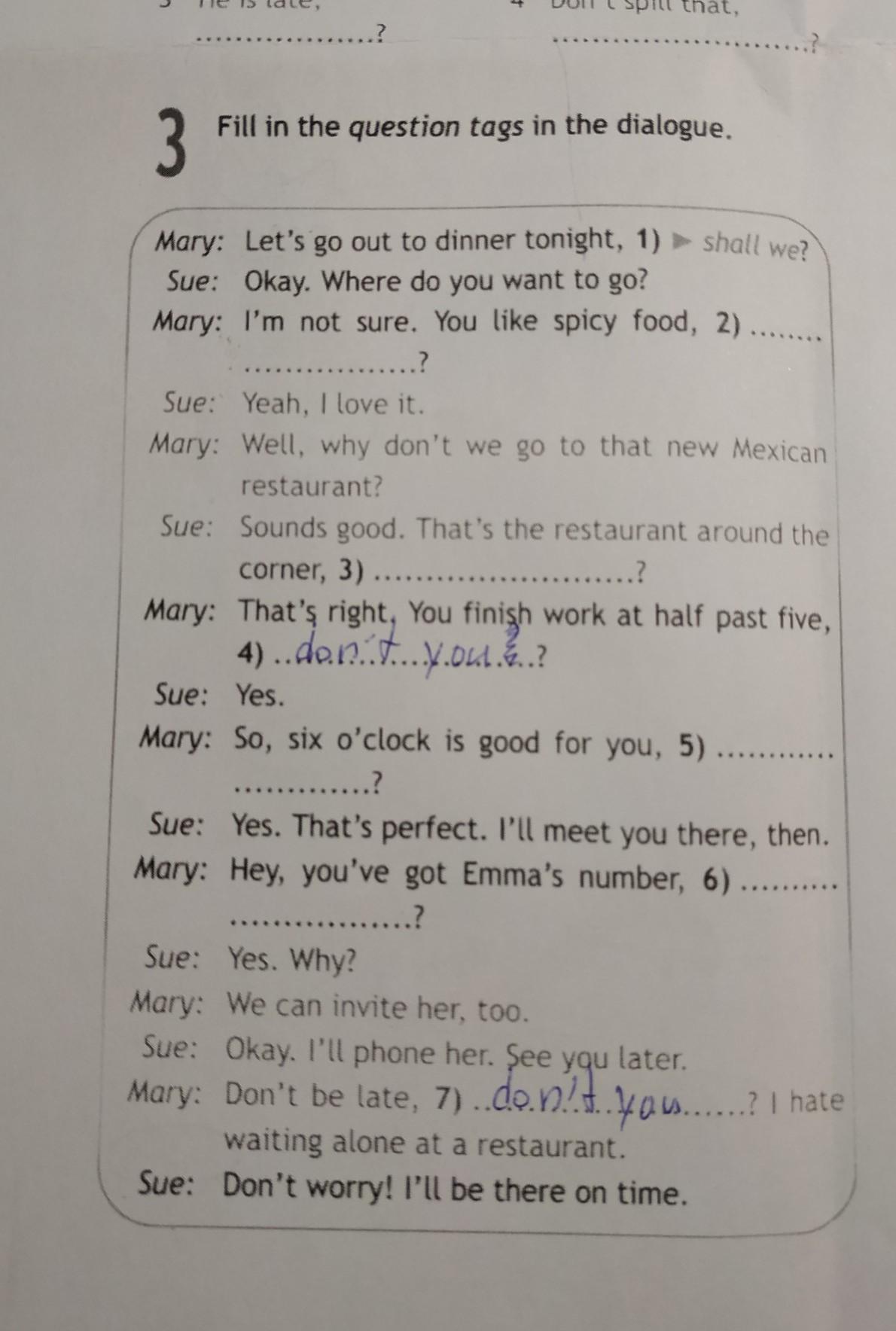 3 Fill in the question tags in the dialogue. shall we? Mary: Let's go out to dinner tonight, 1) Sue: Okay. Where do you want to go? Mary: I'm not sure. You like spicy food, 2)........ Sue: Yeah, I love it. Mary: Well, why don't we go to that new Mexican restaurant? Sue: Sounds good. That's the restaurant around the corner, 3) ........ Mary: That's right, You finish work at half past five, 4)..dan... you...? Sue: Yes. Mary: So, six o'clock is good for you, 5) .? Sue: Yes. That's perfect. I'll meet you there, then. Mary: Hey, you've got Emma's number, 6) Sue: Yes. Why? Mary: We can invite her, too. Sue: Okay. I'll phone her. See you later. Mary: Don't be late, 7)..do.n?. you....? I hate waiting alone at a restaurant. Sue: Don't worry! I'll be there on time.