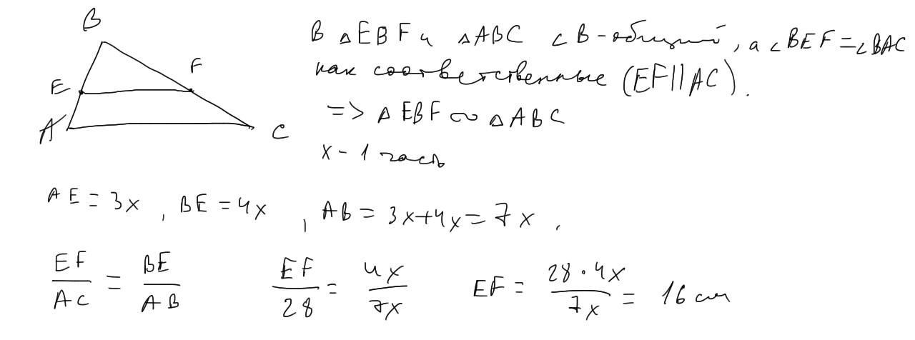 на стороні АВ трикутника АВС позначили точку Е так, що АЕ:ВЕ=3:4. Через точку Е провели пряму, яка паралельна стороні АС трикутника та перетинає сторону ВС у точці F. знайдіть відрізок EF , якщо АС=28см
