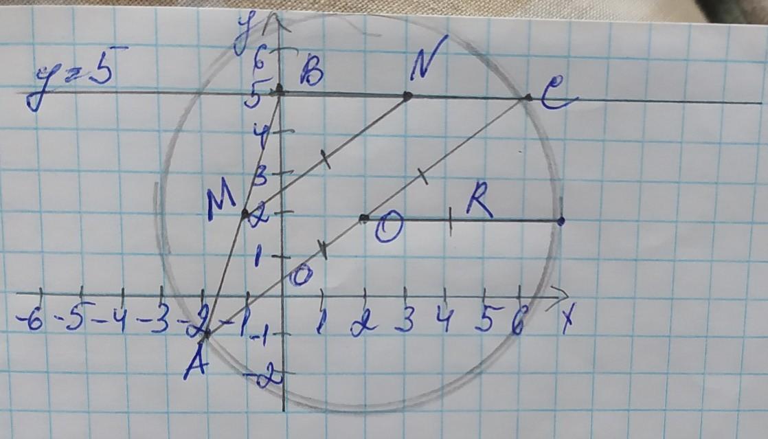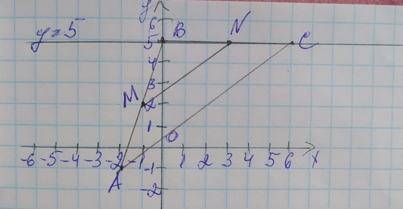 ∆АВС; А(–2; –1); В(0; 5); С(6; 5); МN – середня лінія ∆АВС; MN || AC; M ∈ AB; пряма у=5
