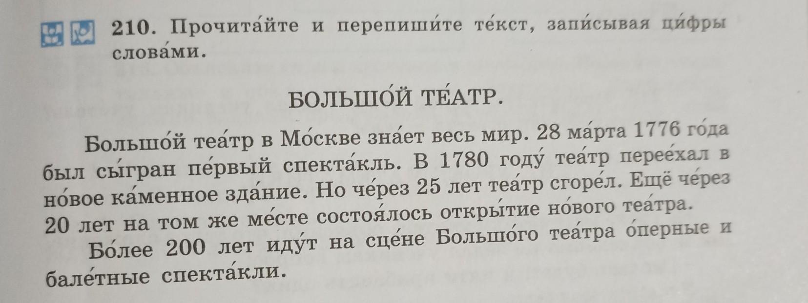 210 Прочитайте и перепишите текст, записывая цифры словами. БОЛЬШОЙ ТЕАТР. Большой театр в Москве знает весь мир. 28 марта 1776 года был сыгран первый спектакль. В 1780 году театр переехал в новое каменное здание. Но через 25 лет театр сгорел. Ещё через 20 лет на том же месте состоялось открытие нового театра. Более 200 лет идут на сцене Большого театра оперные и балетные спектакли.