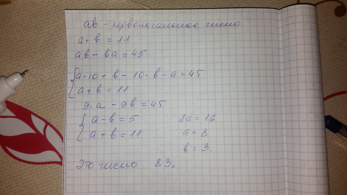 После того как в некотором двузначном числе сумма цифр которого равна 11 цифры поменялись местами оно уменьшилось на 45 чему равна сумма первоначального и получившегося числа. Должно быть 3 , 4, 6 или 8