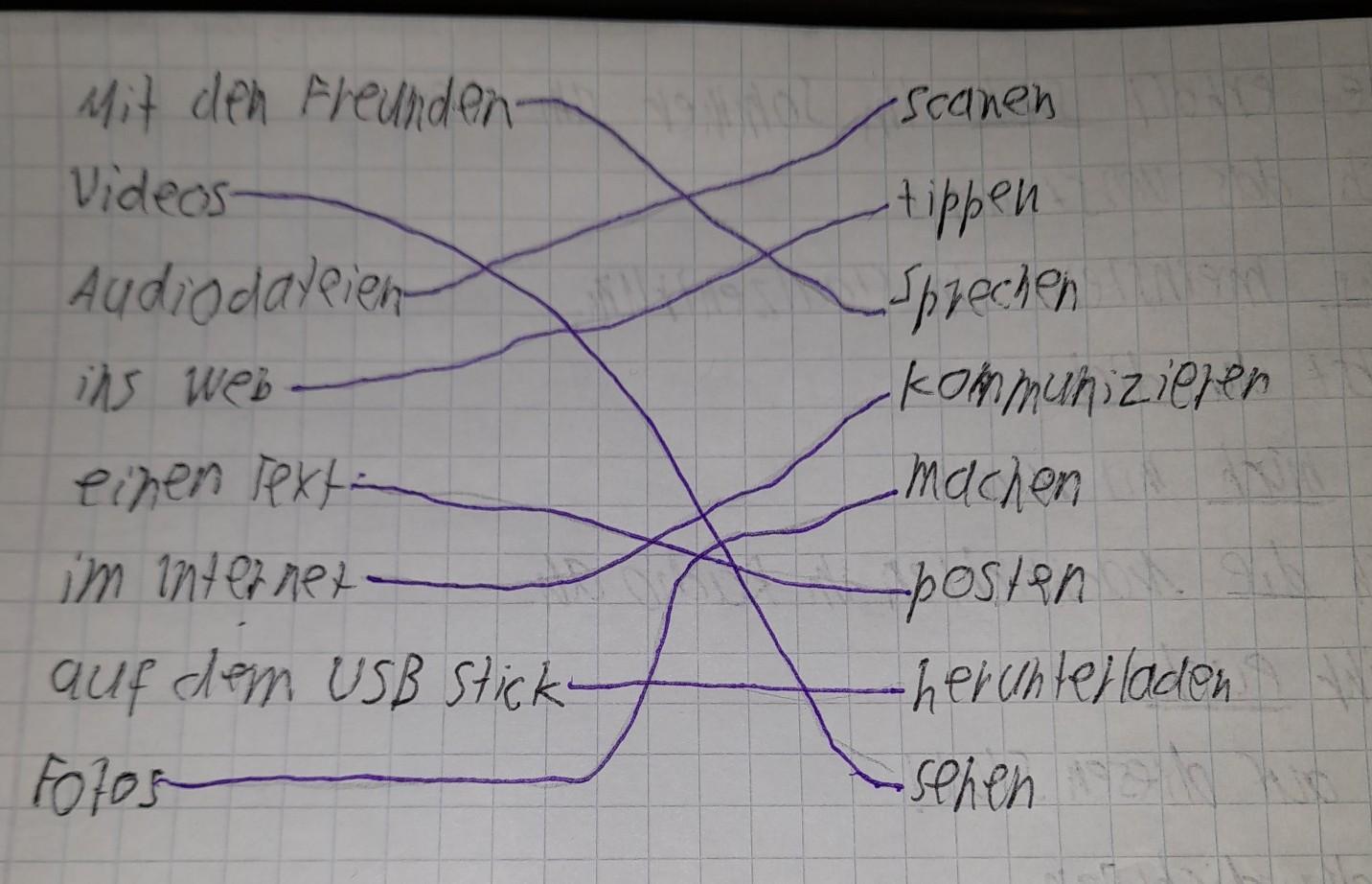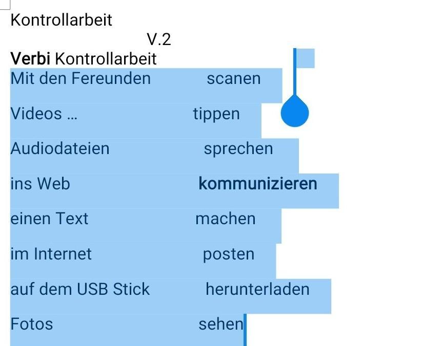 Verbi Kontrollarbeit Mit den Fereunden scanen Videos … tippen Audiodateien sprechen ins Web kommunizieren einen Text machen im Internet posten auf dem USB Stick herunterladen Fotos sehen