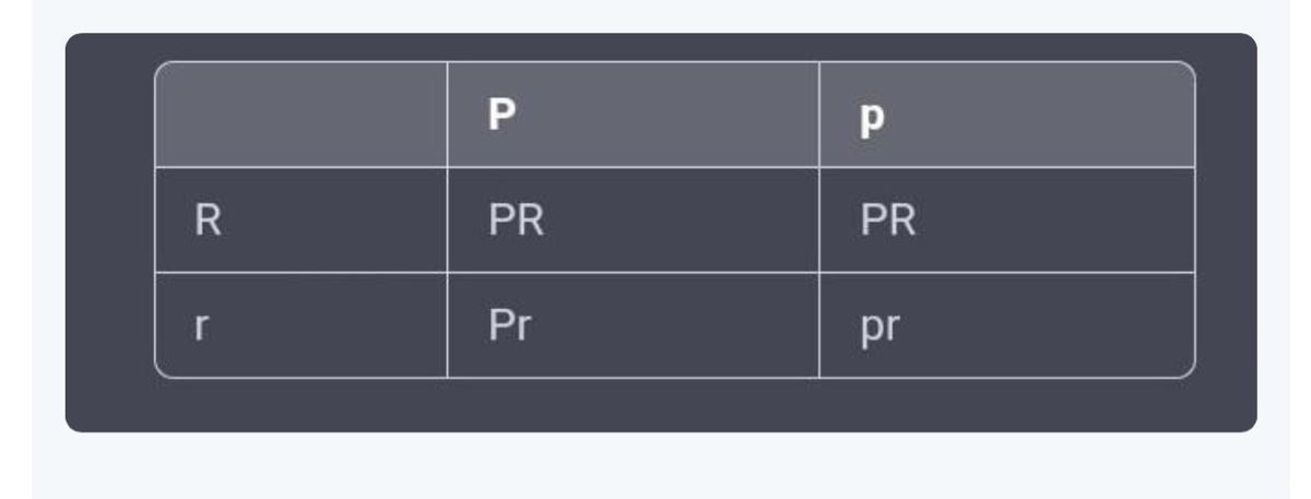У цьому випадку нащадки матимуть 75% шансів мати фіолетову квітку (PR або Pr) і 25% ймовірність мати білу квітку (pr). Нащадки також матимуть 75% ймовірність мати колючу насіннєву оболонку (PR або Pr) і 25% ймовірність мати гладку насіннєву оболонку (pr). З 480 нащадків 360 матимуть фіолетові квіти та колючу насіннєву оболонку, тоді як 120 матимуть білі квіти та гладку насіннєву оболонку.