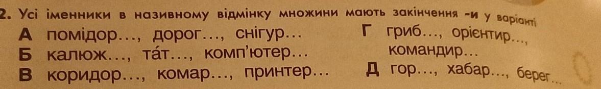 2. Усі іменники в називному відмінку множини мають закінчення -и у варіанті А помідор..., дорог..., снігур... Г гриб.... орiєнтир.... командир... Б калюж..., тат..., комп'ютер... в коридор..., комар..., принтер... д гор.... хабар..., берег...