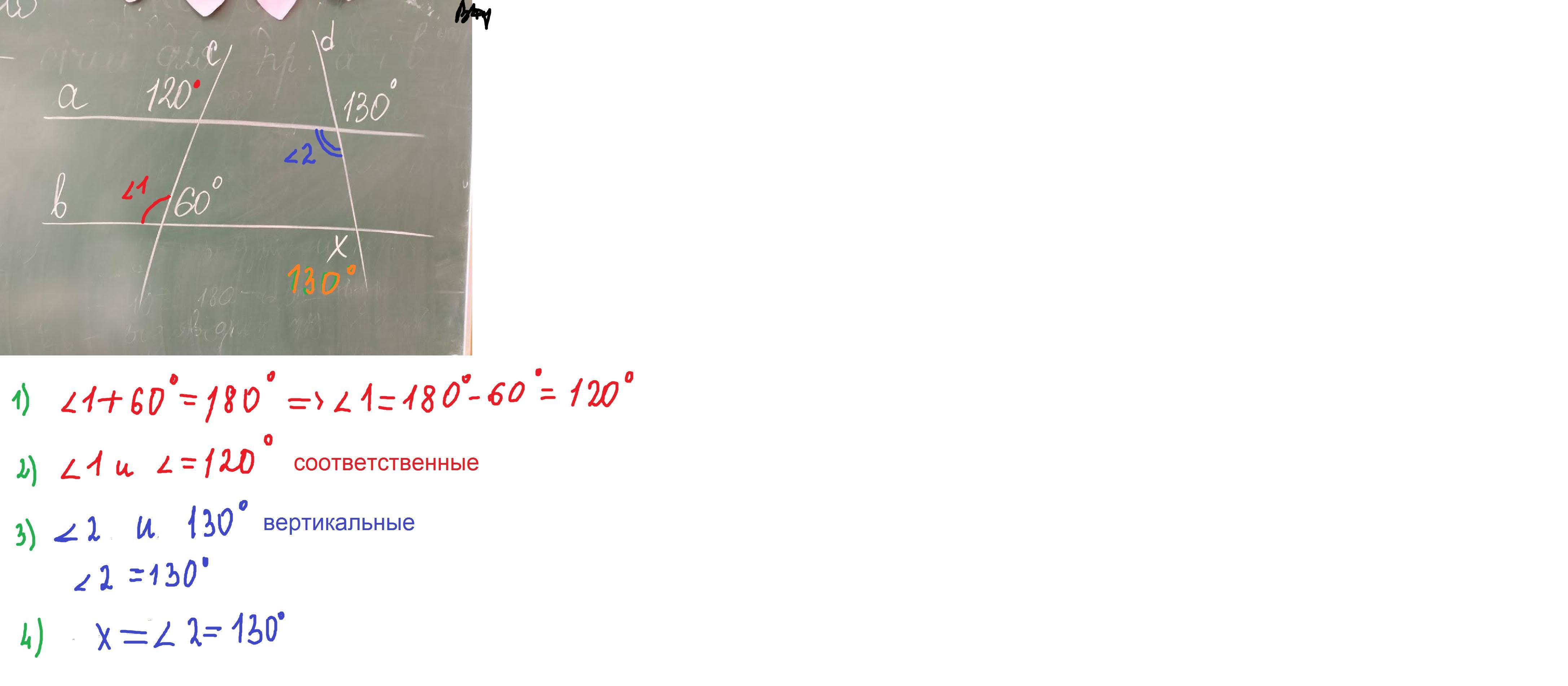 4) ∠2 и Х это соответственные углы при параллельных прямых,и значит они равны,поэтому Х=130°