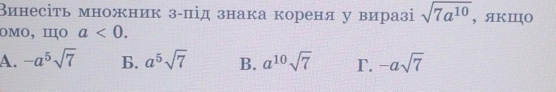 9. Винесіть множник з-під знака кореня у виразі √7a¹⁰, якщо відомо, що а < 0.