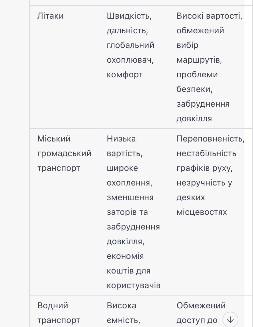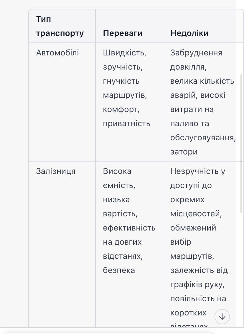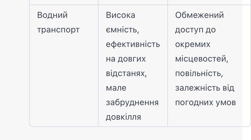 Практичне завдання За текстом підручника визначте переваги й недоліки основних видів транспорту. Результати роботи подайте у вигляді таблиці.