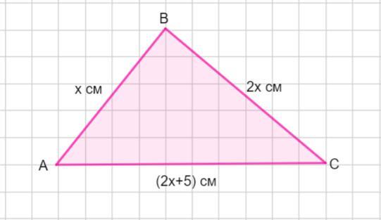 Пусть дан ΔАВС . Пусть АВ = х см. Тогда ВС =2х см , а АС =(2х+5) см.