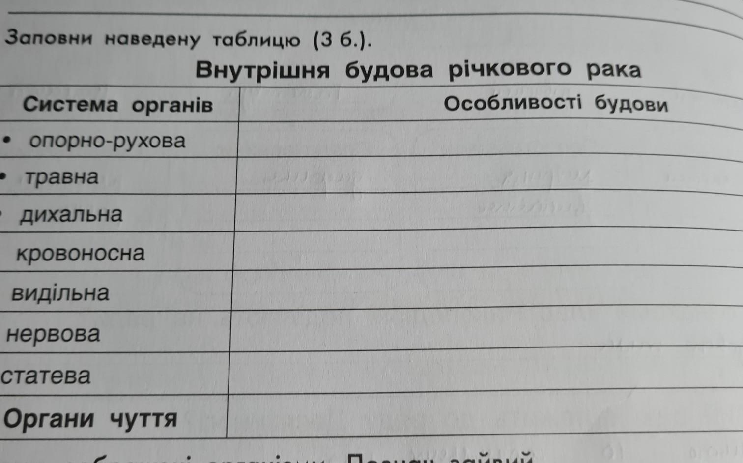 2. Заповни наведену таблицю ). ● Система органів опорно-рухова травна дихальна кровоносна • видільна нервова ● статева Внутрішня будова річкового рака Особливості будови Органи чуття дам 30 б