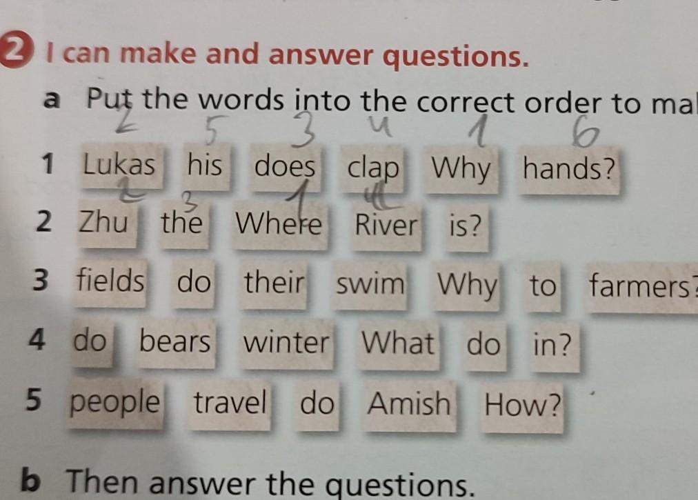 2 I can make and answer questions. a Put the words into the correct order to make questions. 1 Lukas his does clap Why hands? 2 Zhu the Where River is? 3 fields do their swim Why to farmers? 4 do bears winter What do in? 5 people travel do Amish How?