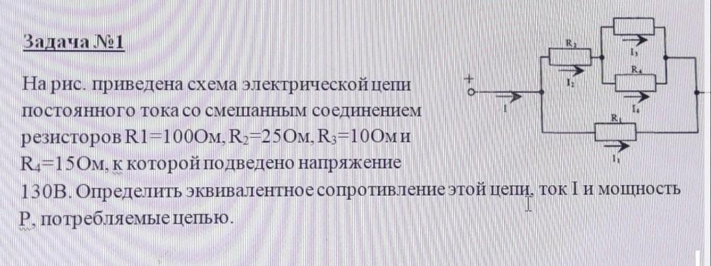 Задача №1 На рис. приведена схема электрической цепи постоянного тока со смешанным соединением резисторов R1=1000M,R2=250M, R3=100ми R4=150м, к которой подведено напряжение 130В. Определить эквивалентное сопротивление этой цепи, ток I и мощность P, потребляемые цепью.