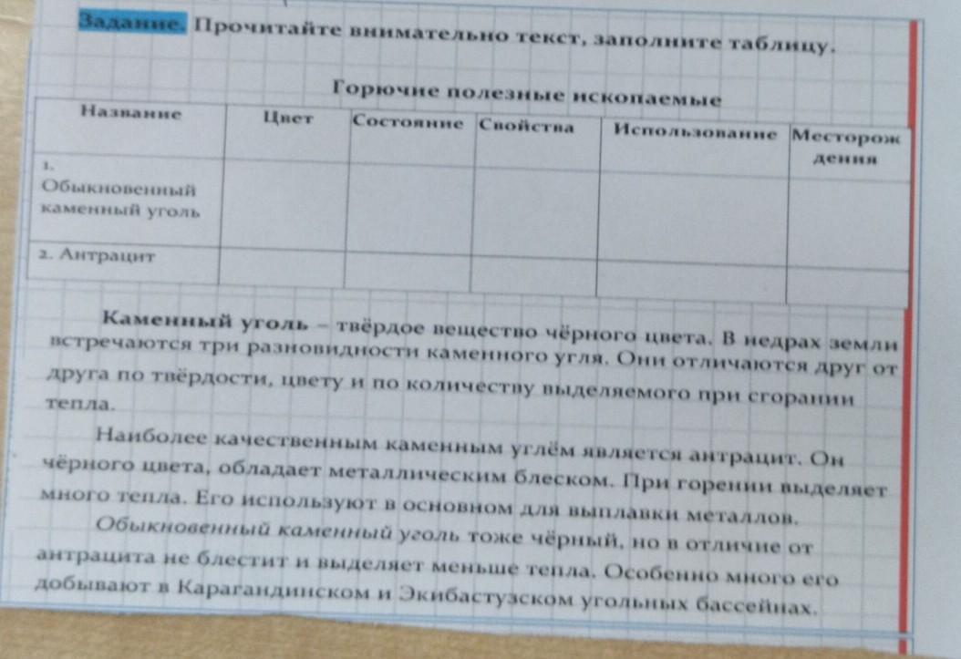 Каменый уголь: цвет чёрный состояние: твердое свойства: они отличаются друг от друга твердостю, цвету и по количеству выделяемого при сгорания тепла использование: бытовое, энергетическое топливо, сырье для металлургической и химической промышленности, а также для извлечения из него редких и рассеянных элементов. месторождения: недры земли
