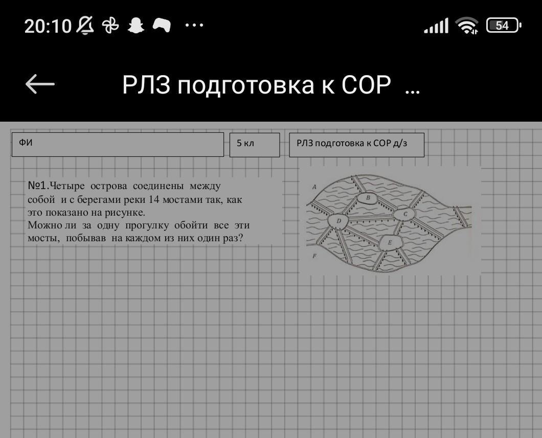 No1. Четыре острова соединены между собой и с берегами реки 14 мостами так, как это показано на рисунке. Можно ли за одну прогулку обойти все эти мосты, побывав на каждом из них один раз?
