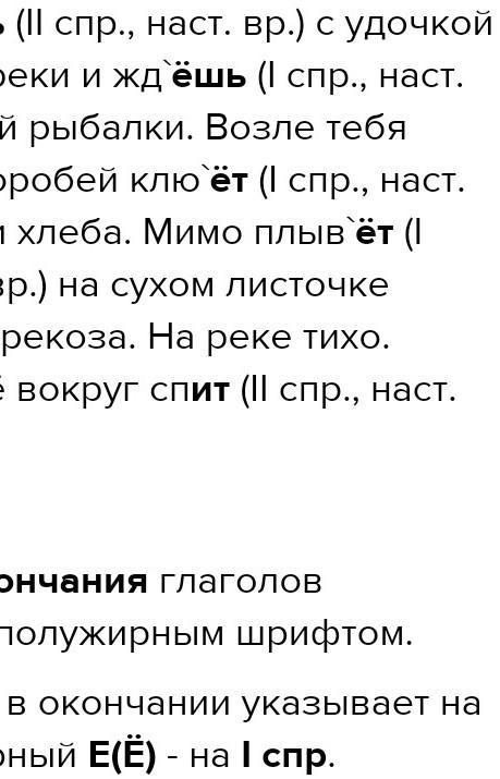 9. Спиши. Вставь пропущенные буквы и раскрой скобки. Ты с...дишь (с)удочкой (на).......... .....ки и ждёшь удач- й рыбалки. Возле тебя шустрый в.......бей клюëт¹ крошки хлеба. Мимо плывёт (на)сух.... л...сточке изящн...я стрек...за. (Ha)...ке тихо. Словно всё в...круг спит. Определи время и спряжение глаголов. Обозначь их окончания. по лицам и числам. В зависимости ОТ ЛИЧНЫх окончаний глаголы Глаголы в настоящем и будущем времени... то есть изменяются относятся к ... или ... спряжению.