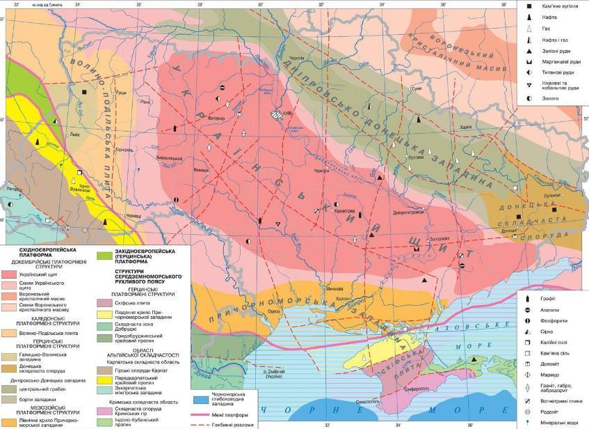- 2. Геологічна будова.Тут розташовані такі геолого-тектонічні структури як Український щит, Волино-Подільська плита, Південно-західна околиця Східно-Європейської платформи, Дніпровсько-Донецька западина.