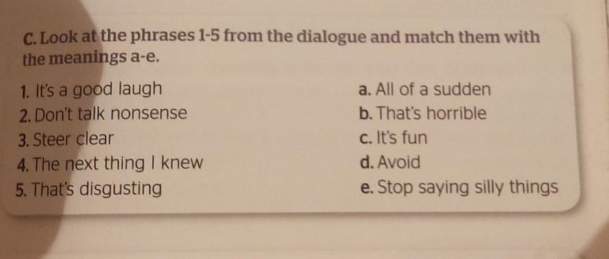 C. Look at the phrases 1-5 from the dialogue and match them with the meanings a-e. 1. It's a good laugh 2. Don't talk nonsense 3. Steer clear 4. The next thing I knew 5. That's disgusting a. All of a sudden b. That's horrible c. It's fun d. Avoid e. Stop saying silly things