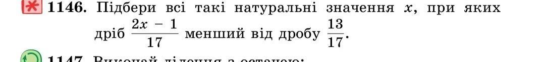 [* 1146. Підбери всі такі натуральні значення х, при яких 2x 1 дріб менший від дробу - 17 13 17°