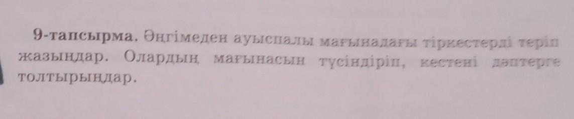 9-тапсырма Әңгімеден ауыспалы мағынадағы тіркестерді теріп жазыңдар.Олардың мағынасын түсіндіріп, кестені дәптерге толтырыңдар