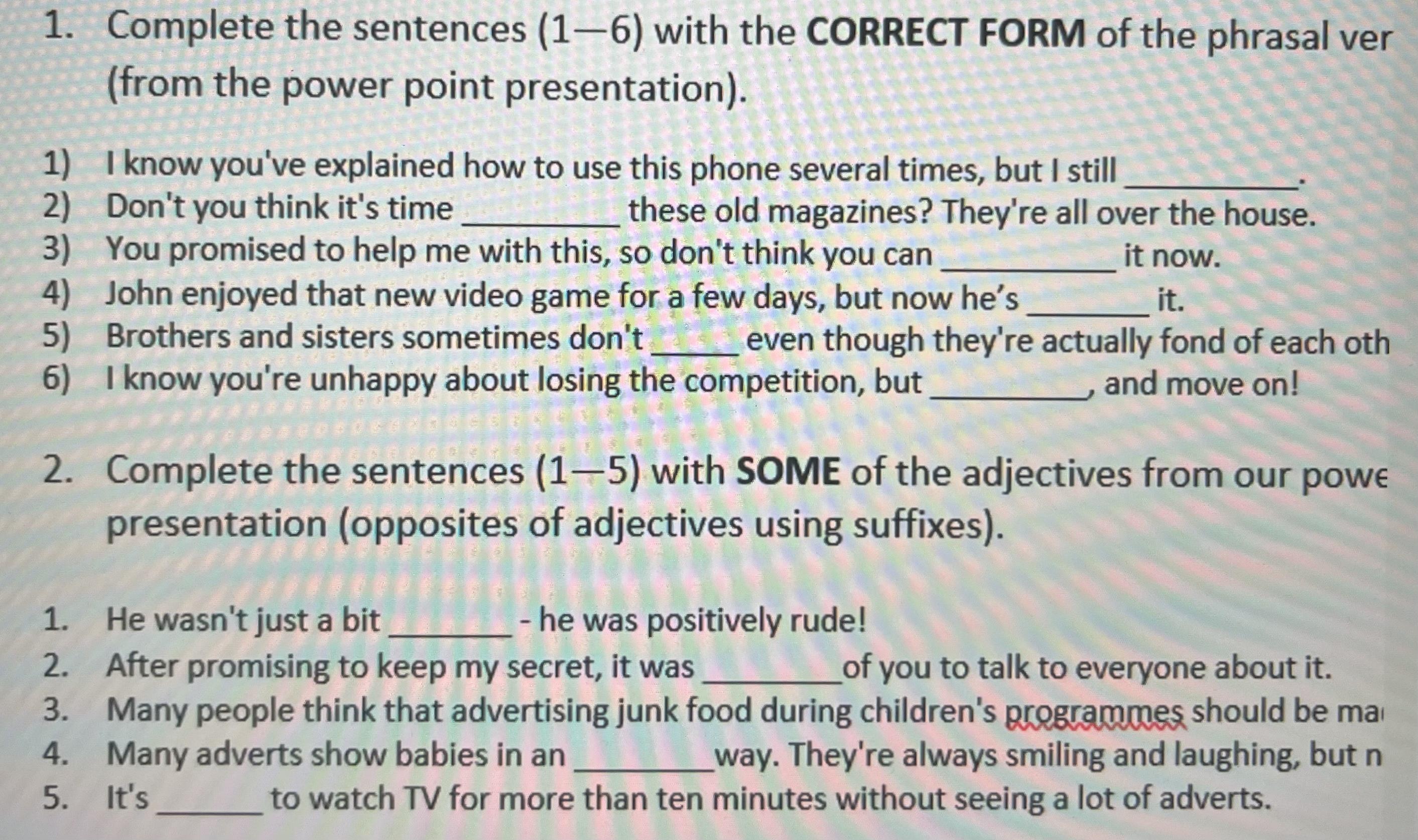 Complete the sentences (1-6) with the CORRECT FORM of the phrasal verb (from the power point presentation).