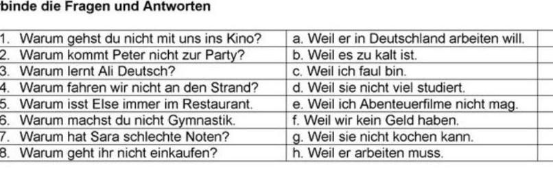 rbinde die Fragen und Antworten 1. Warum gehst du nicht mit uns ins Kino? 2. Warum kommt Peter nicht zur Party? 3. Warum lernt Ali Deutsch? 4. Warum fahren wir nicht an den Strand? 5. Warum isst Else immer im Restaurant. 6. Warum machst du nicht Gymnastik. 7. Warum hat Sara schlechte Noten? 8. Warum geht ihr nicht einkaufen? a. Weil er in Deutschland arbeiten will. b. Weil es zu kalt ist. c. Weil ich faul bin. d. Weil sie nicht viel studiert. e. Weil ich Abenteuerfilme nicht mag. f. Weil wir kein Geld haben. g. Weil sie nicht kochen kann. h. Weil er arbeiten muss.