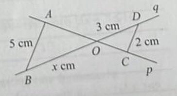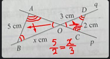 На чертеже прямые p и q пересекаются в одной точке O, а отрезки прямых AB и CD параллельны. Если AB=5cm, CD=2cm и OD=3cm, какова длина отрезка OB?