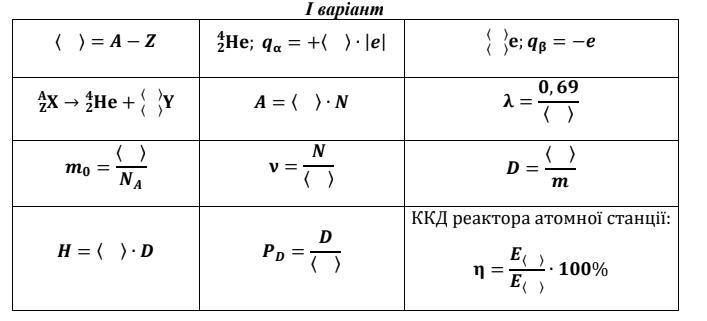 Заповніть таблицю: для цього, відтворіть формули, вписавши символи необхідних фізичних величин.