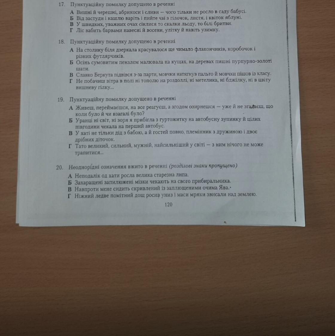 21. Неоднорідні означення вжито в реченні (розділові знаки пропущено) А Гриб-часничник тонконогий з буруватою шапинкою замінив мені часник Б Сивий з'їдений часом камінь груба робота сліди стертої вітрами посмішки. В Ой як класно що вже почнуться літні канікули такі довгі й такі безтурботні. Г Вулиця зустріла різким запахом мокрого асфальту та молодого липового листя. 22. Однорідні означення вжито в реченні (розділові знаки пропущено) А Жовтий кленовий листок здригався на губах коли дівчинка говорила. Б на раменах лежить велика пухнаста хустка мамі стало холодно? В У порожній двокімнатній квартирі пахло вапном і свіжою фарбою. Г Щаслива зворушена виступом улюбленого гурту я поверталася з концерту. 23. Однорідні означення вжито в реченні (розділові знаки пропущено) А Просто з кущів стриміла тонка гнучка шия на кінці якої прилаштувалася маленька пласка голова з міцним дзьобом. Б Напудрене плоске обличчя немов перекреслене впоперек усмішкою схиляється для поцілунку. В Чи не тому наш герой переміг що поруч билося сповнене найпалкішого почуття закохане серденько. Г та знову запала ніч темна липка напарена близькими старицями ріки. 24. Пунктуаційну помилку допущено в реченні А На хлопцеві - шкіряна, рокерська куртка темно-коричневого, майже чорного кольору. Б Мама майже одного зі мною зросту, зовсім як школярка зі своїм маленьким жовтим портфелем. В це той час, коли спека спадає і тихий, повитий млою степ лежить в очікуванні вечірньої прохолоди. Г Сонцесяйні, замріяні очі шукають серед буднів небуденне.