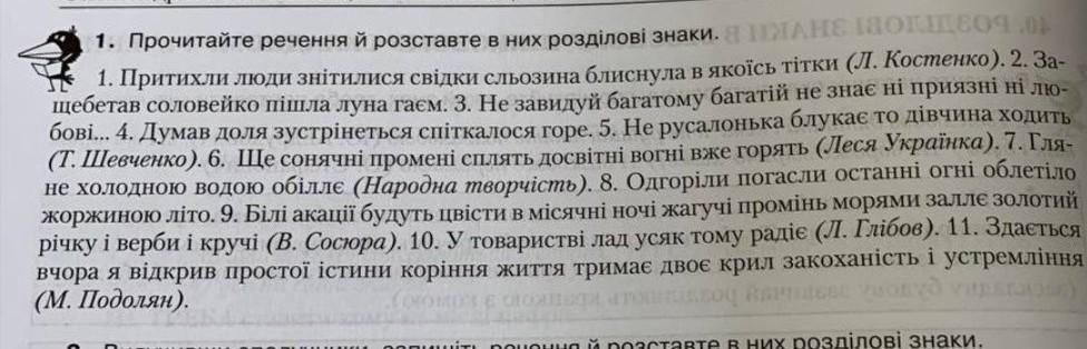 1. Прочитайте речення й розставте в них розділові знаки. ЖАНЕ ПООЧ 02 1. Притихли люди знітилися свідки сльозина блиснула в якоїсь тітки (Л. Костенко). 2. За- щебетав соловейко пішла луна гаєм. 3. Не завидуй багатому багатій не знає ні приязні ні лю- бові.. 4. Думав доля зустрінеться спіткалося горе. 5. Не русалонька блукає то дiвчина ходить (Т. Шевченко). 6. Ще сонячні промені сплять досвiтні вогні вже горять (Леся Українка). 7. Гля- не холодною водою обіллє (Народна творчість). 8. Одгоріли погасли останні огні облетіло жоржиною літо. 9. Білі акації будуть цвісти в місячні ночi жагучі промінь морями заллє золотий річку і верби і кручі (В. Сосюра). 10. У товаристві лад усяк тому радіє (Л. Глібов). 11. Здається вчора я відкрив простої істини коріння життя тримає двоє крил закоханість і устремління (М. Подолян). COROLO E CORTI Aarnese uongo varsa)