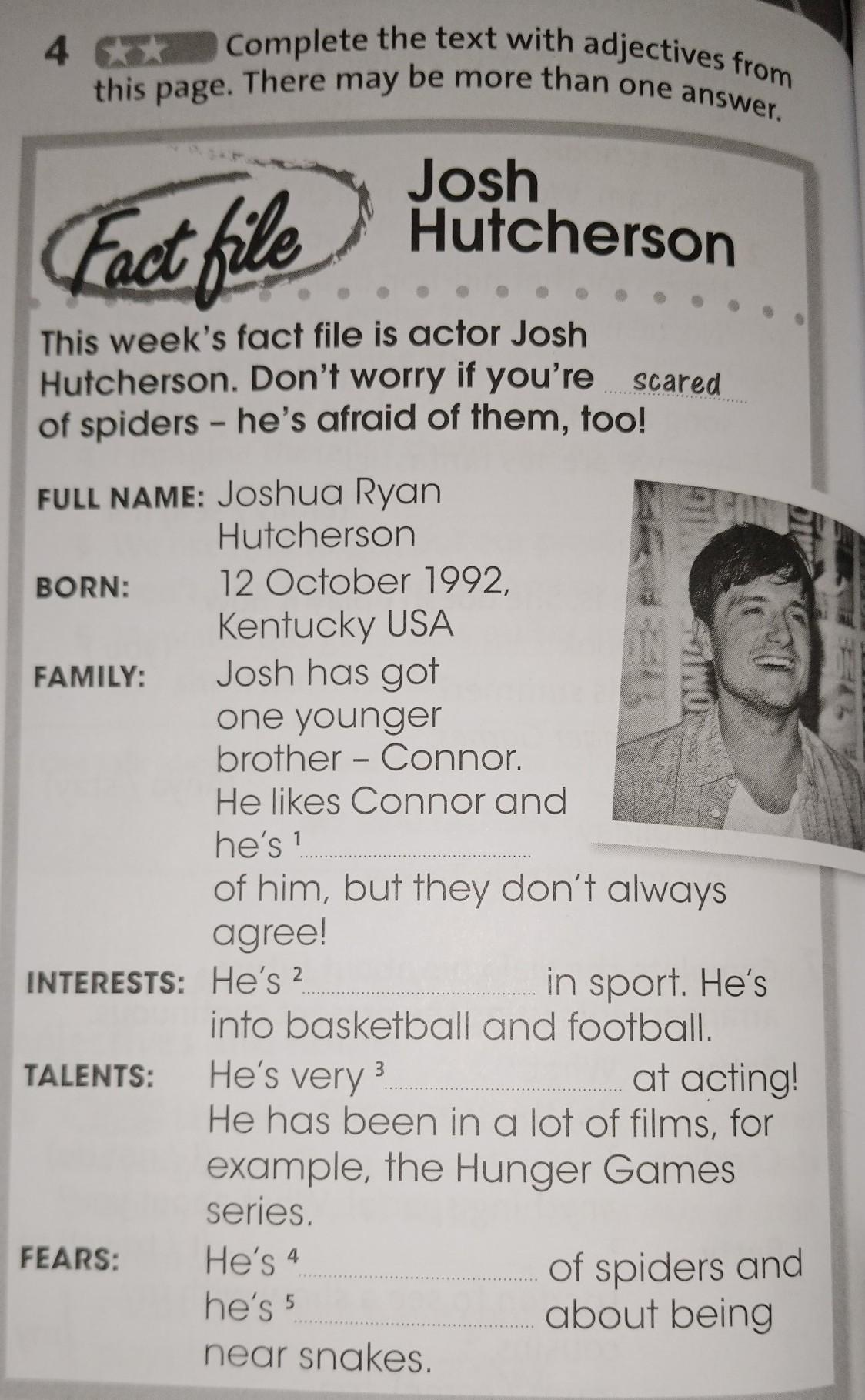 4 Complete the text with adjectives from this page. There may be more than one answer. Josh Hutcherson Fact file This week's fact file is actor Josh Hutcherson. Don't worry if you're of spiders - he's afraid of them, too! FULL NAME: Joshua Ryan Hutcherson BORN: FAMILY: TALENTS: FEARS: 12 October 1992, Kentucky USA Josh has got one younger brother - Connor. INTERESTS: He's 2 He likes Connor and he's ¹ 1 of him, but they don't always agree! scared in sport. He's into basketball and football. He's 4 he's 5 near snakes. He's very ³ at acting! He has been in a lot of films, for example, the Hunger Games series. of spiders and about being