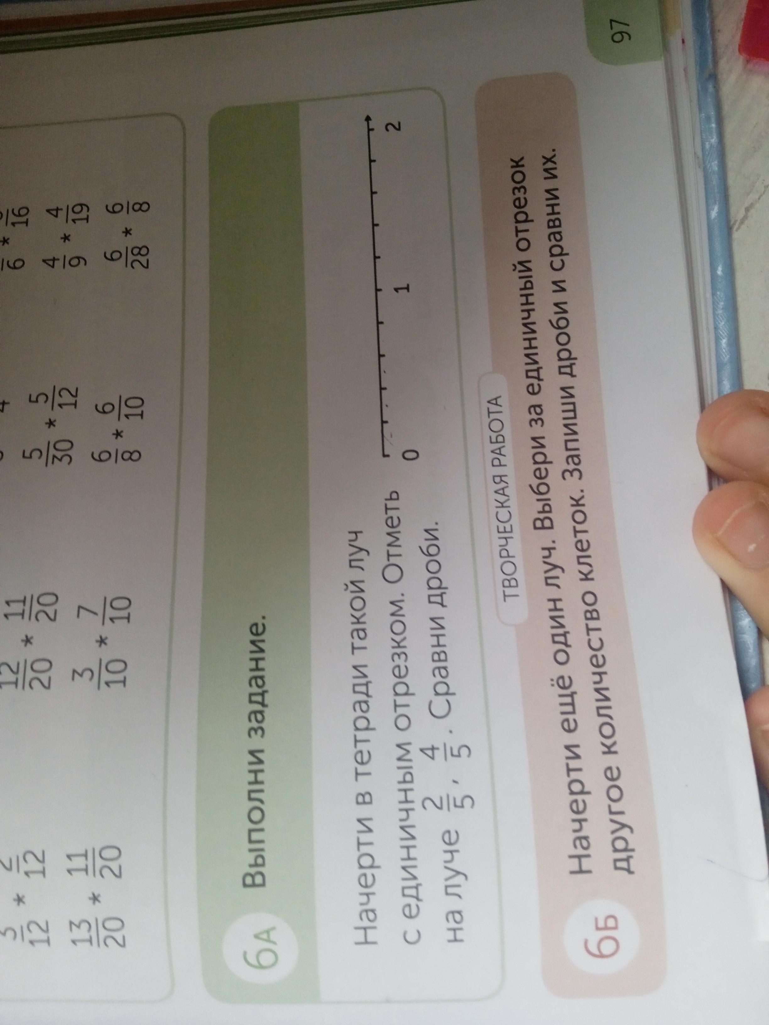 Начерти в тетради такой луч с единичным отрезком.Отметь на луче ⅖,⅘.Сравни дроби.