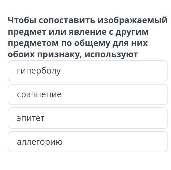 Чтобы сопоставить изображаемый предмет или явление с другим предметом по общему для них обоих признаку, используют гиперболу сравнение эпитет аллегорию.