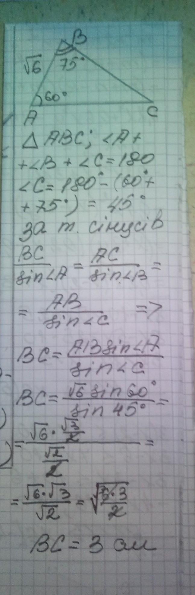 Одна із сторін трикутника дорівнює √6 см, а прилеглі до неї кути -60° і 75°. Знайдіть другу сторону трикутника, яка прилягає до кута 75°.