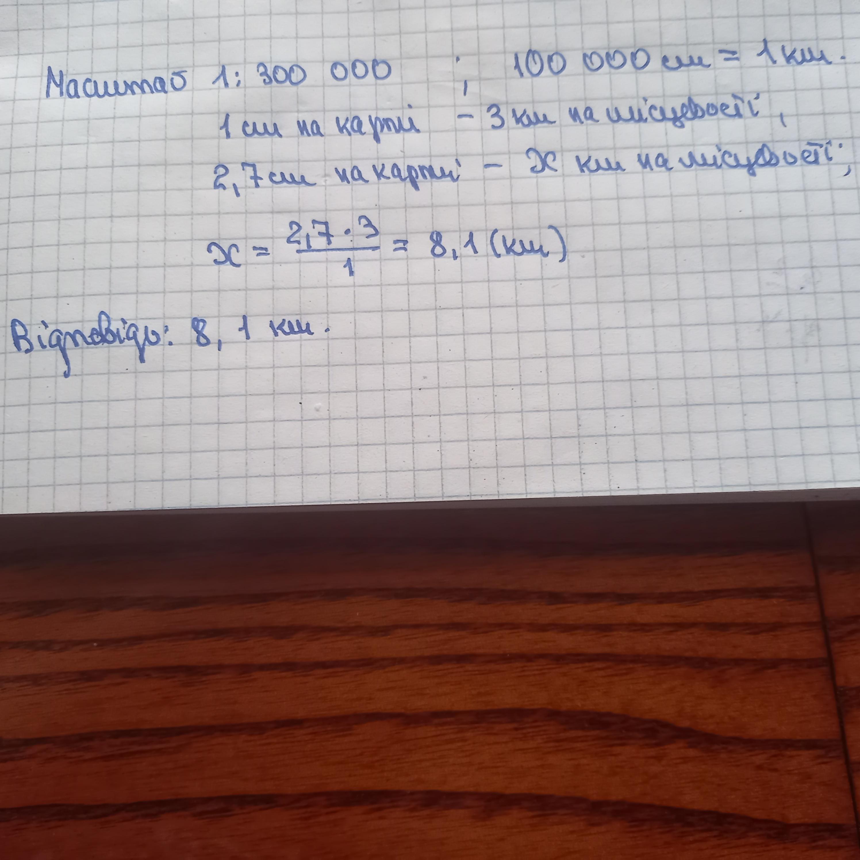 1:300000=3 км , Нехай х це відстань між двома містами на місцевості 1 см=3 км, 2,7 см=? х км→х=2,7*3=8,1 км