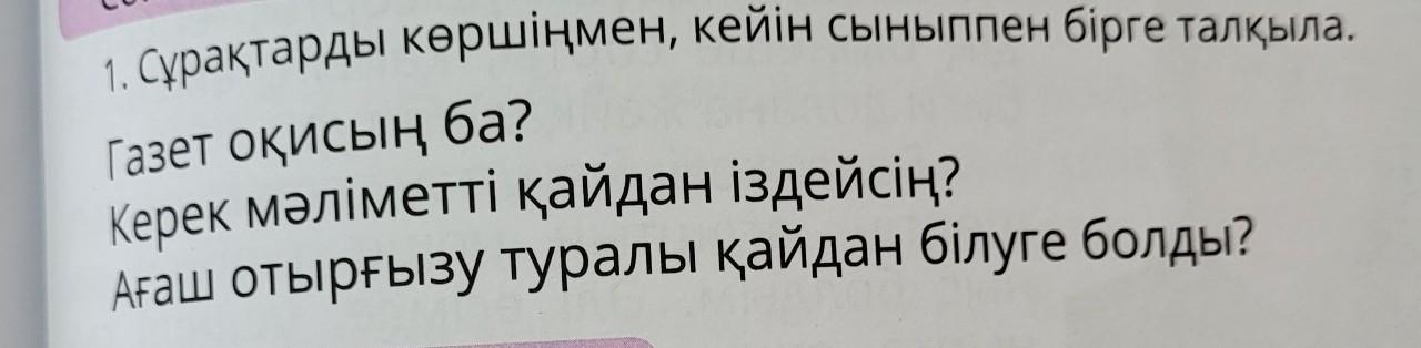 1. Сұрақтарды көршіңмен, кейін сыныппен бірге талқыла. Газет оқисың ба? Керек мәліметті қайдан іздейсің? Ағаш отырғызу туралы қайдан білуге болды?