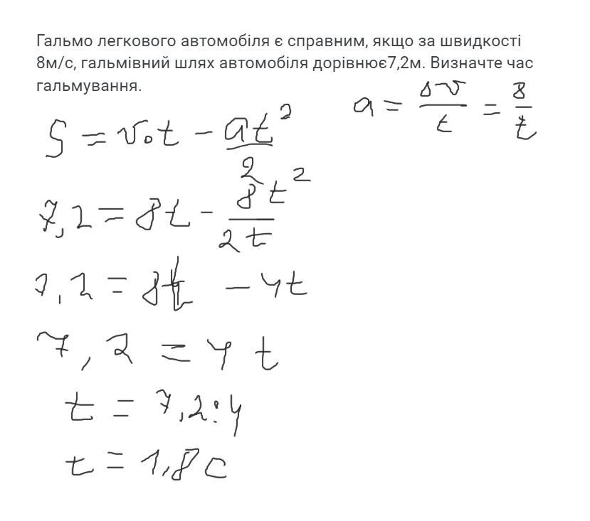 Гальмо легкового автомобіля є справним, якщо за швидкості 8м/с, гальмівний шлях автомобіля дорівнює7,2м. Визначте час гальмування.