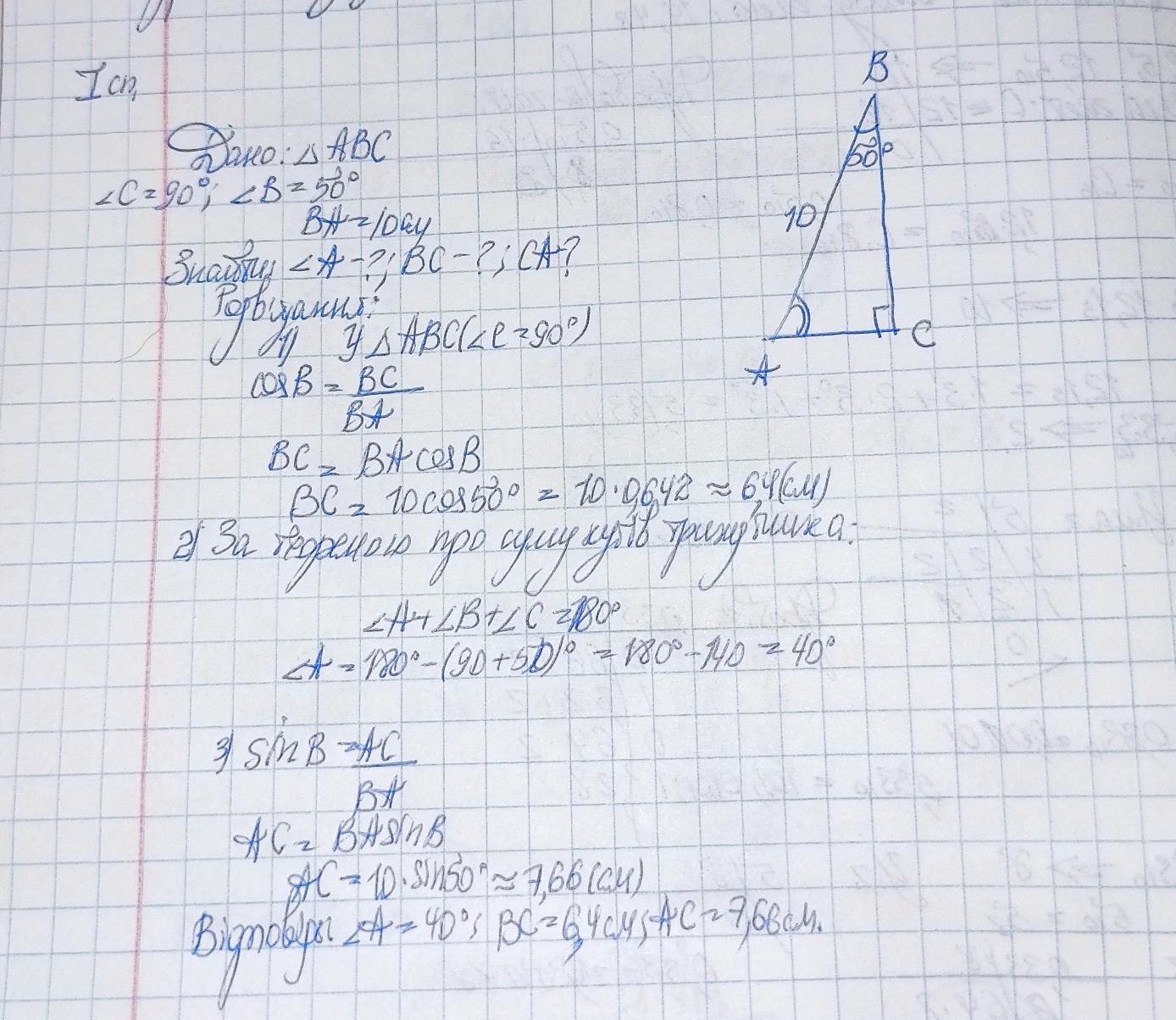 2)Розв'яжіть прямокутний трикутник за гіпотенузою 10см та гострим кутом 50 градусів(4ий тип задач за гіпотенузою та гострим кутом)