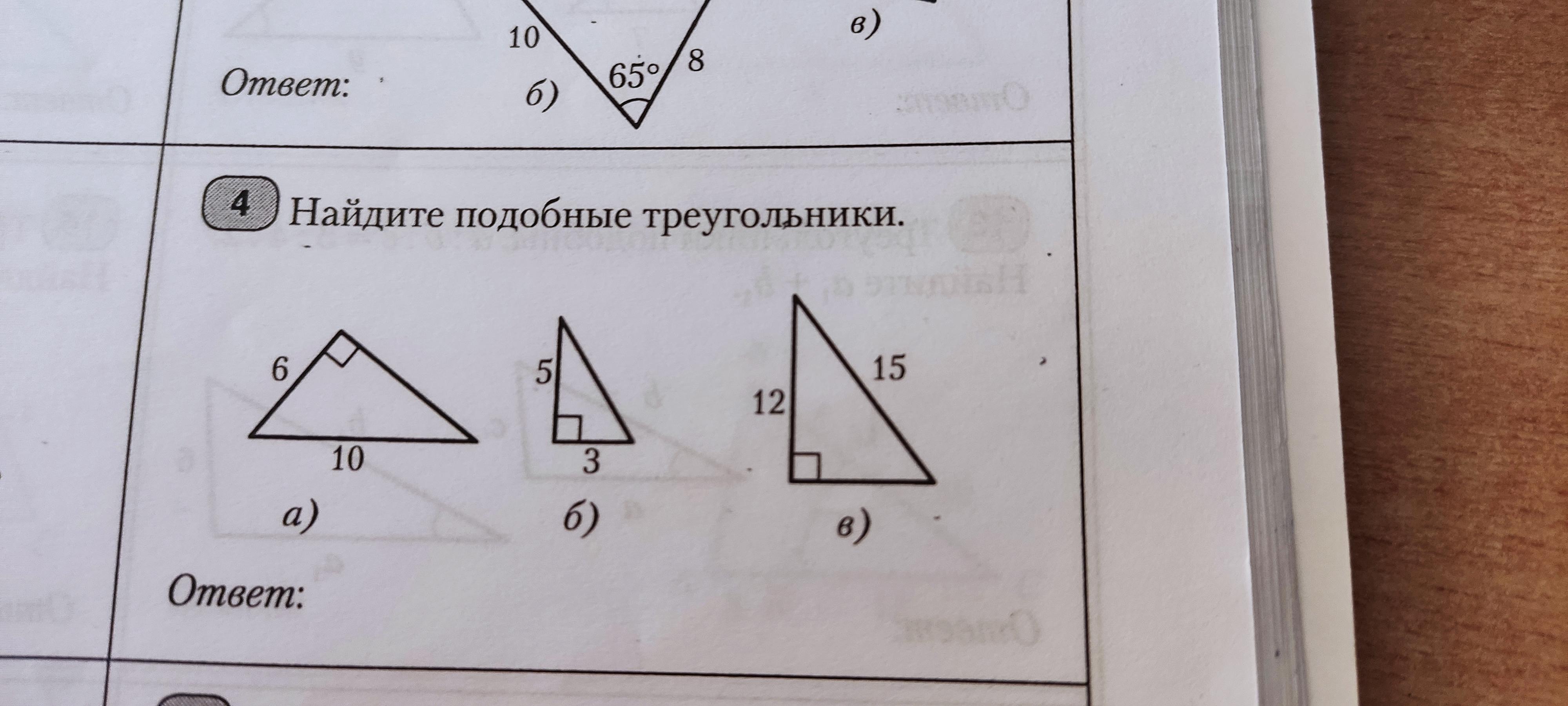 подобными треугольниками в этом задании являются «б» и «в», поскольку они оба прямоугольные ( это указано на рисунке маленьким квадратным углом = 90° ), и исходя из этого они равны по двум сторонам и углу между ними