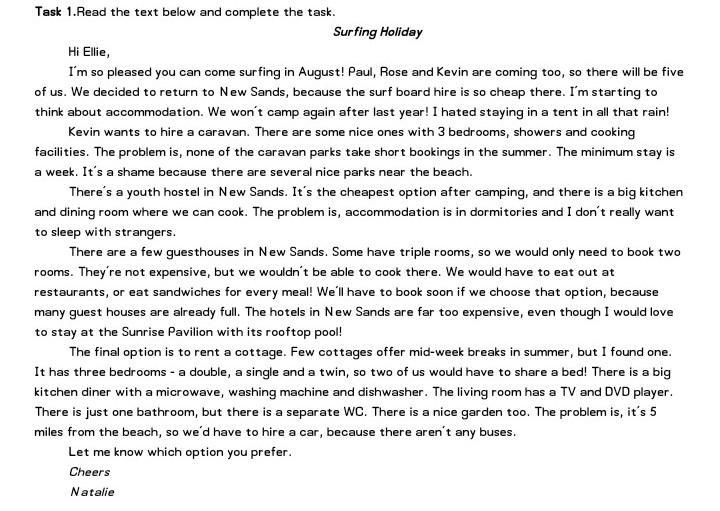 Answer the questions. 1. Where did the friends stay last year? 2. How long do the friends want to stay in New Sands? 3. What does Kevin want to hire? 4. What's the problem with the caravan park? 5. Why did Natalie choose this cottage? 6. What was the problem with the cottage?