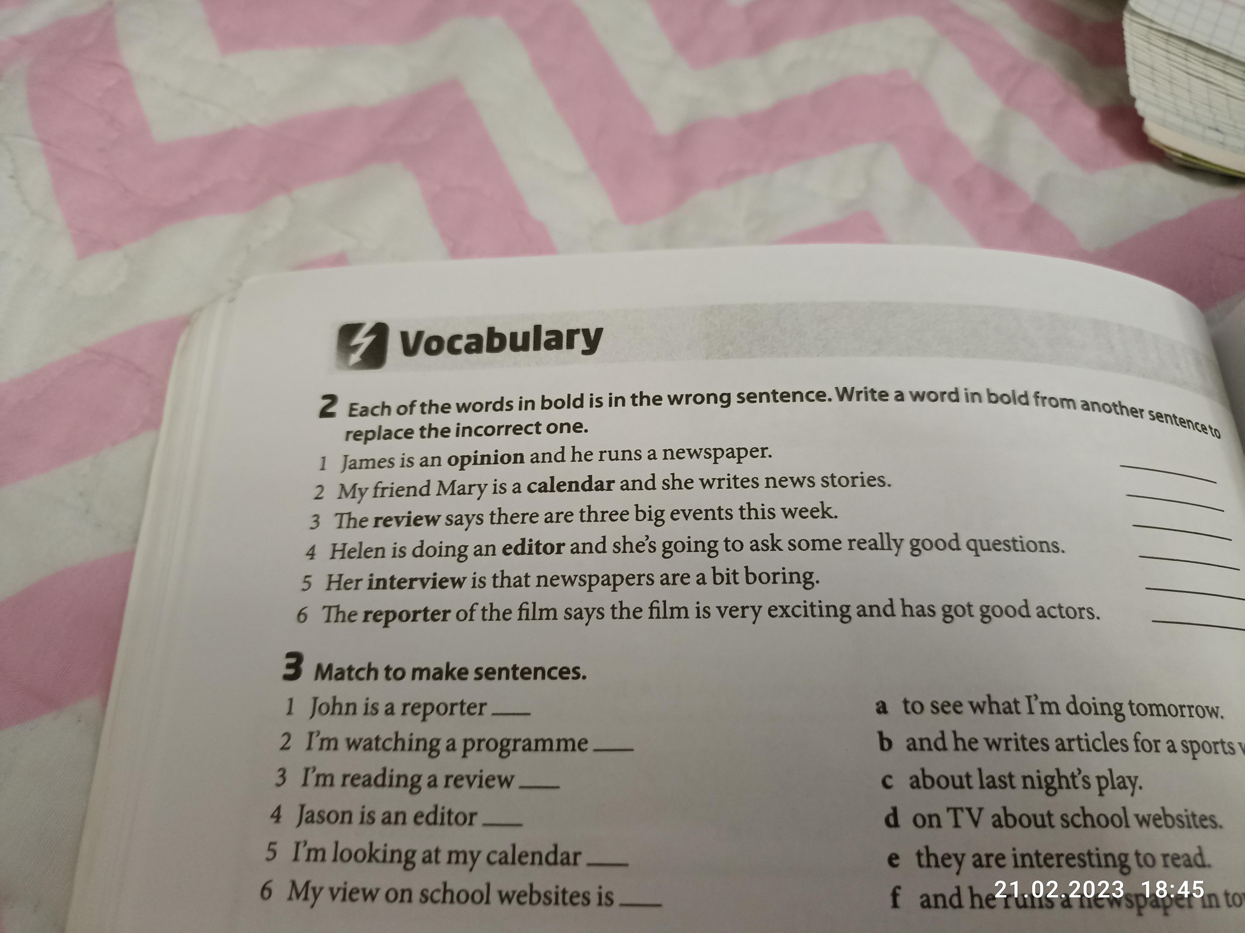 гEach of the words in bold is in the wrong sentence. Write a word in bold