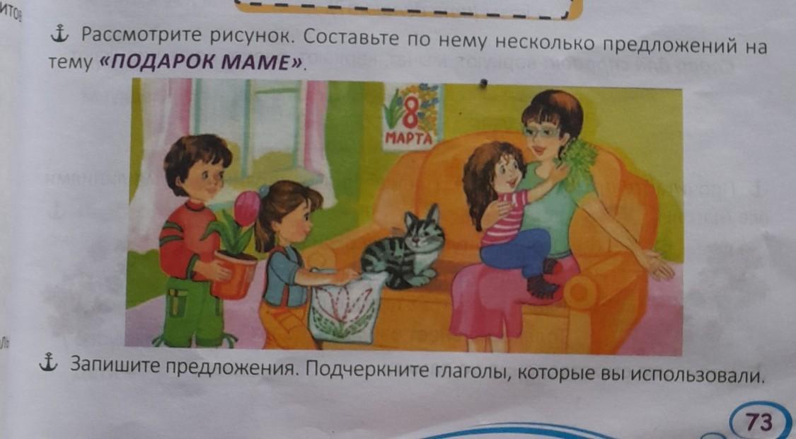 Рассмотрите рисунок. Составьте по нему несколько предложений на тему «ПОДАРОК МАМЕ». 8 MAPTA Запишите предложения. Подчеркните глаголы, которые вы использовал