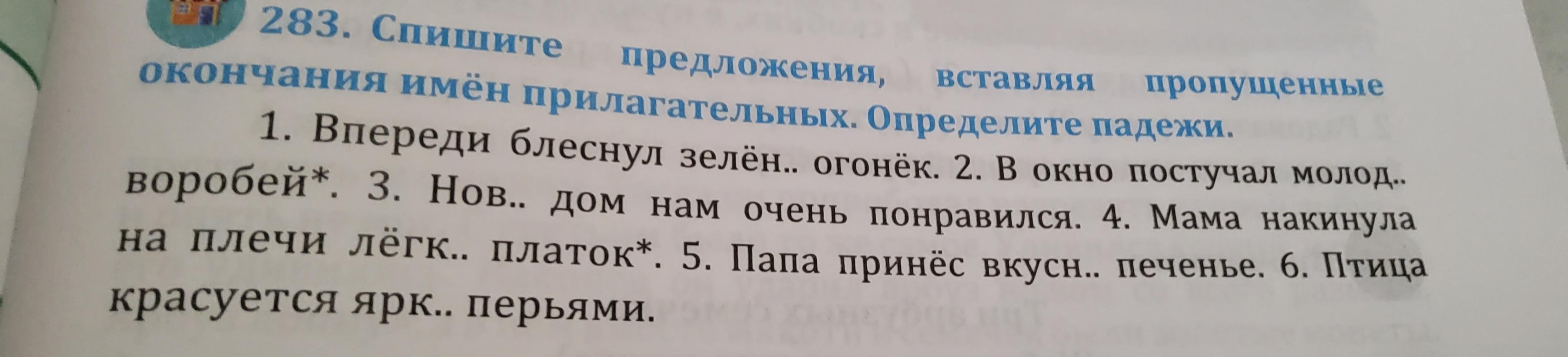 1. Впереди блеснул зелёный огонёк (И.п.). 2. В окно постучал молодой воробей (И.п.). 3. Новый дом (И.п.) нам очень понравился. 4. Мама накинула на плечи лёгкий платок (В.п.). 5. Папа принёс вкусное печенье (В.п.). 6. Птица красуется яркими перьями (Т.п.)